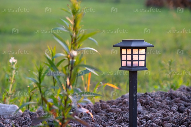 Декоративная солнечная ландшафтная лампа, многолетние растения и мульча в клумбе, экологическое световое решение, энергоэффективное, современный дизайн сада, мягкий современный стиль