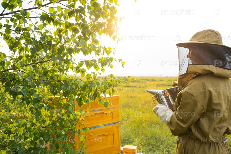 Пчеловод в улье, костюм и перчатки для пчеловодства, осмотр улья в сельской пасеке, естественное производство меда, рамы для сосков, органическое пчеловодство