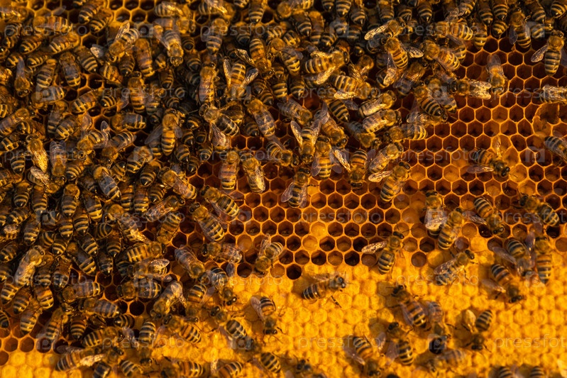 Работнические пчелы на соломе, органическое размножение, детализация рамы, улей, насекомые-опылители, сельское хозяйство, производство меда, управление окружающей средой