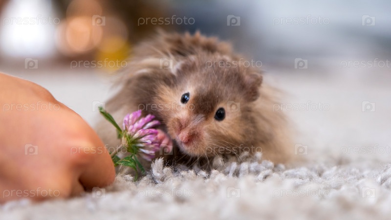 Сирийский хомяк ест цветок, длинная пушистая шерсть, мягкие усы, вегетарианская диета, милый питомец дома, нежный грызун для детей, естественное поведение