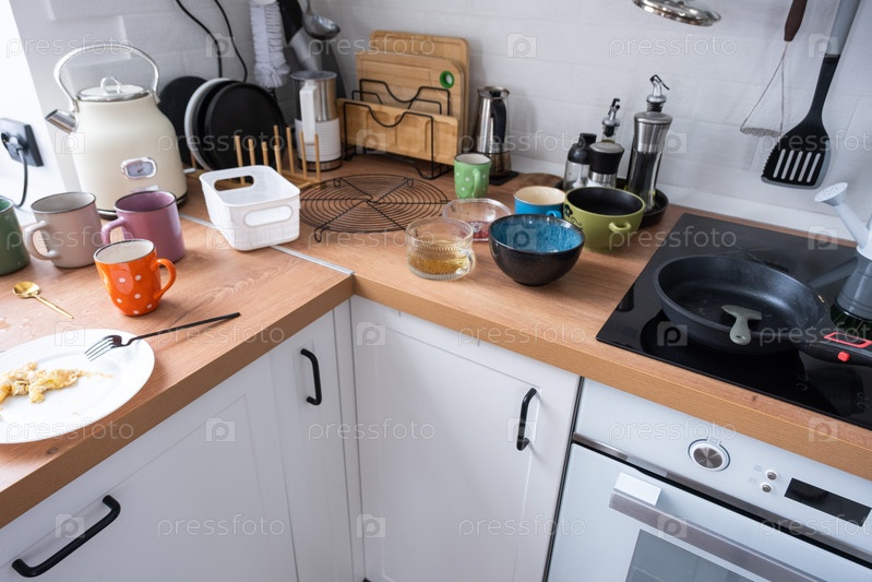 Беспорядок на кухне, грязные очки, кубки для складирования, немытые тарелки, пятна с едой, хаос в кухне, разбросанная посуда, беспорядочная печь, неурегулированная ежедневная уборка, домашний бардак
