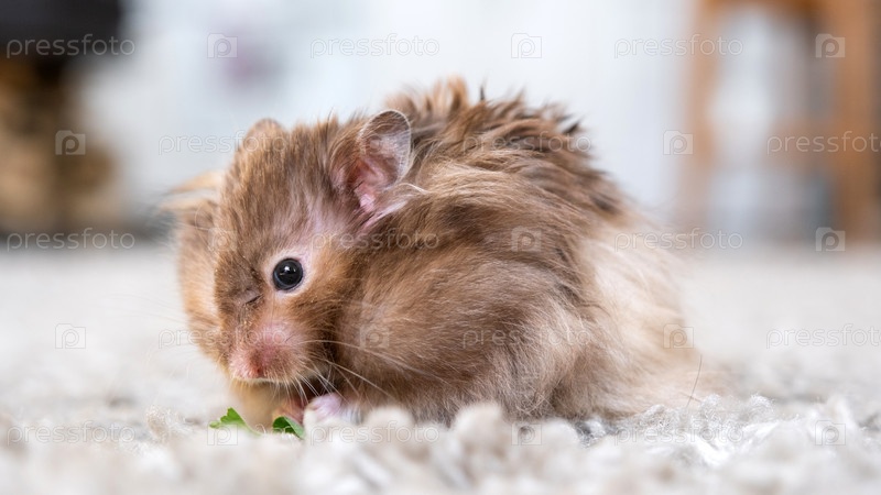 Коричневый длинношерстный сирийский хомячок, держащий петрушку, любопытный питомец, натуральная шерсть, дома, вегетарианская закуска, очаровательная и мягкая, подходящая для семейных фотографий