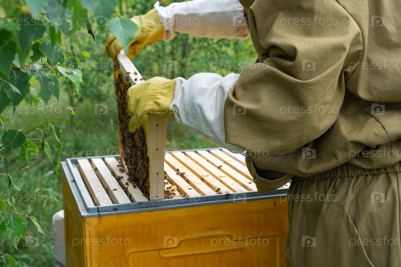 Пчеловод проверяет рамы, пчел на восковом гребне, процесс ульев, сельское производство меда, органическое производство, обзор улья, естественное сельское хозяйство, пчеловодство, здоровье колонии