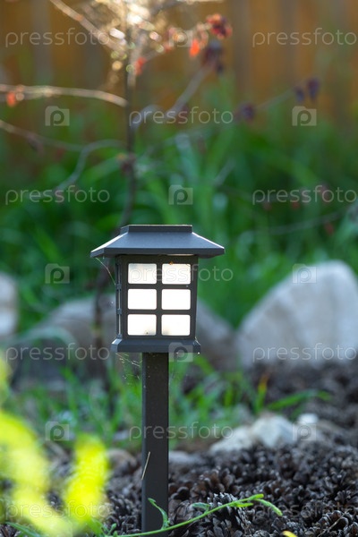 Многолетняя клумба с солнечной садовой лампой, мульчом, большими валунами, смесью травы и лилий, минималистский эко-дизайн, ночное светодиодное акцентное освещение
