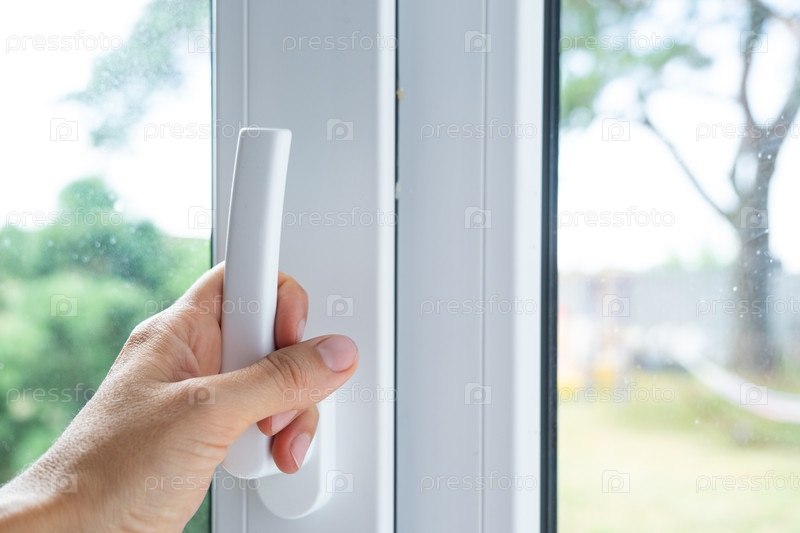 Пальчик на ручке окна, открытие для вентиляции, пластиковое оборудование, проветривающая комната, перекрестное дыхание и свежий воздух, современная рама, уход за домашним хозяйством, охрана