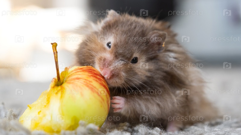 Сирийский хомяк ест яблоко, длинные пушистые волосы, всеядная диета, безопасная пища для хомяков, домашний любимец для детей, уход за домом, очаровательный и прирученный