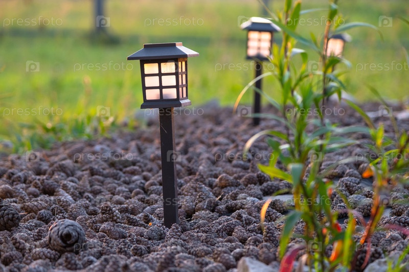 Современный пограничный сад с фонарем на солнечной энергии, смешанная мульча, травы и многолетние растения, устойчивое ландшафтное освещение, эко-дизайн touch, светодиодная дорожная лампа