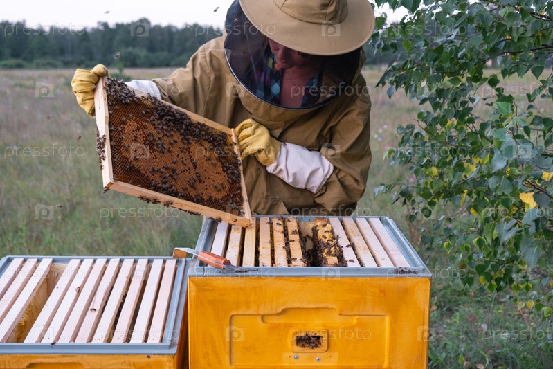 Удаление рамы из улья, осмотр соломинки, пчеловод в костюме, процесс пчеловодства, управление пасеками, производство меда, сельская традиция