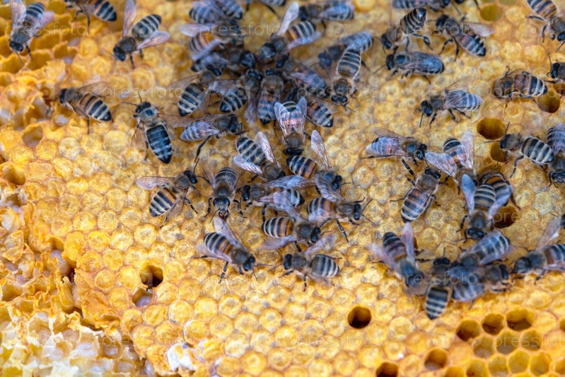 Группа пчел на гребне, ближайшее изображение, активное производство меда, пчеловодство, органическое сельское хозяйство, детали улья, естественный процесс пчелиного двора, насекомые-опылители