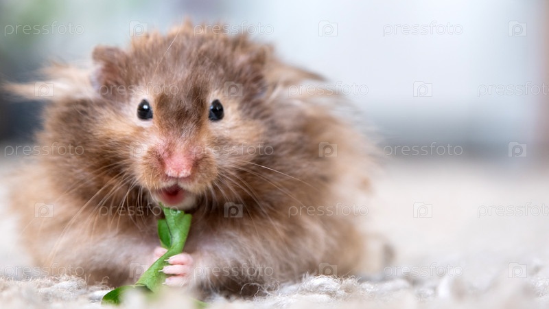 Длинношерстный сирийский хомяк жует овощи, пушистый и уродливый грызун, небольшой питомец, легкий в уходе, подходит для блогов, руководств, ветеринарной информации, детского учебного контента