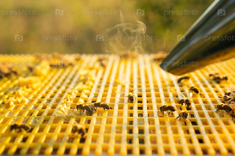 Использование курильщика на улье, управление пчеловодством, контроль колонии пчел, производство меда, устойчивое пчеловодство, здоровье насекомых, фермерский процесс, уход за опылителями