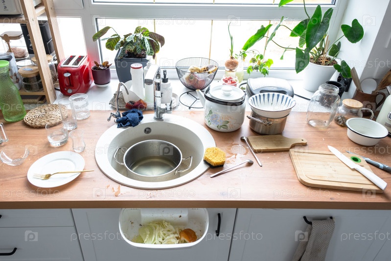 Беспорядочная кухня, грязная посуда в раковине, переполненная столешница, остатки еды, хаос на кухне, неухоженная домашняя сцена, немытая утварь, расстройство реальной жизни