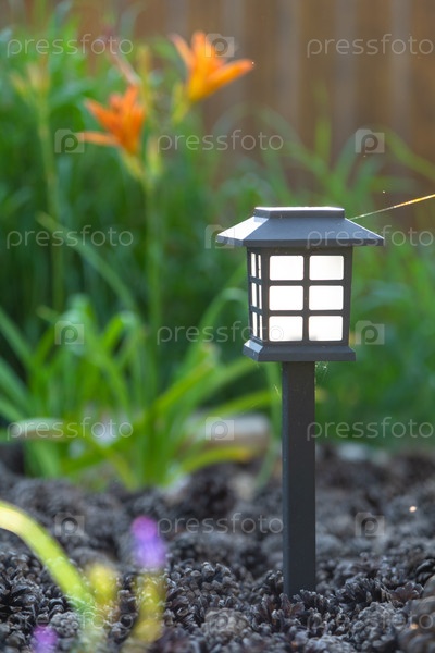 Лампа садовой границы, солнечное светодиодное освещение, многолетняя лилия дневная, молодые кустарники, мульча и композиция скал, ночной эко акцент, стильная минимальная современная кровать