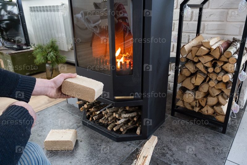 Вставка топливного брикета в камин, эко биомасса для кризисного отопления, экономически эффективное, современное домашнее решение, альтернативный источник энергии, сбережения и устойчивость
