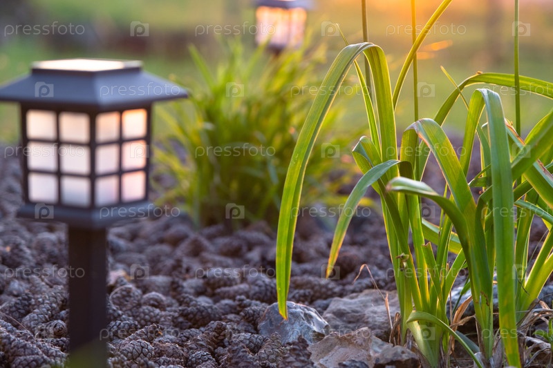 Экологически чистый солнечный светильник, многолетняя смесь в клумбе, современная оборона мульча, декоративные травы, устойчивый ландшафт на открытом воздухе, светодиодный свет, кивка японскому дизайну