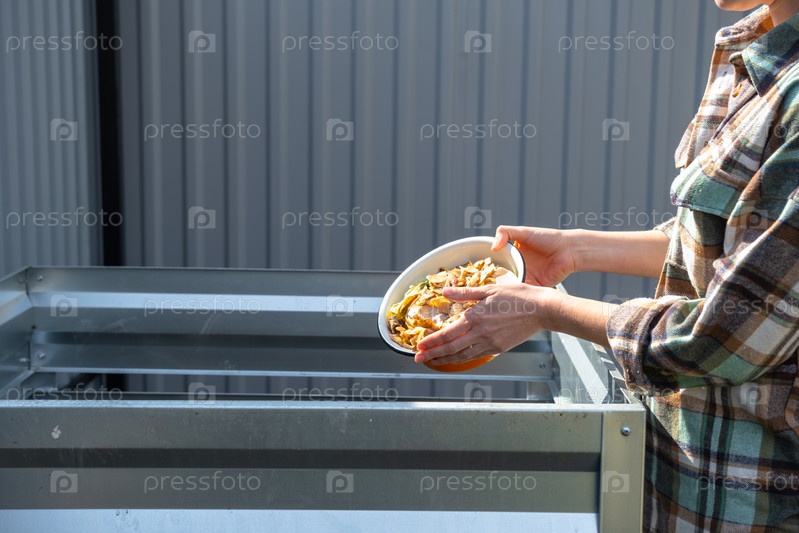 Загрузка овощных и кухонных остатков в компостную корзину, металлическая рама для приготовления садового компоста, экологическое управление отходами, устойчивое обогащение почвы