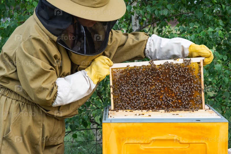 Пчеловод держит раму, пчелы и мед с крышкой в ближайшем плане, тщательный визуальный осмотр, ручная обработка, внимание к здоровью молодняка, органический пчелиный двор
