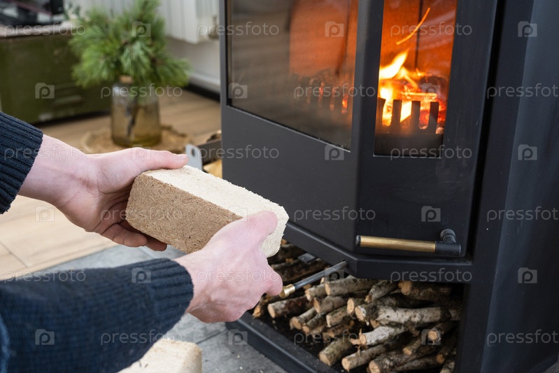 Размещение топливного брикета в печи, процесс загрузки камина эко-брикетами, экономичная альтернатива во время энергетического кризиса, чистое и эффективное тепло