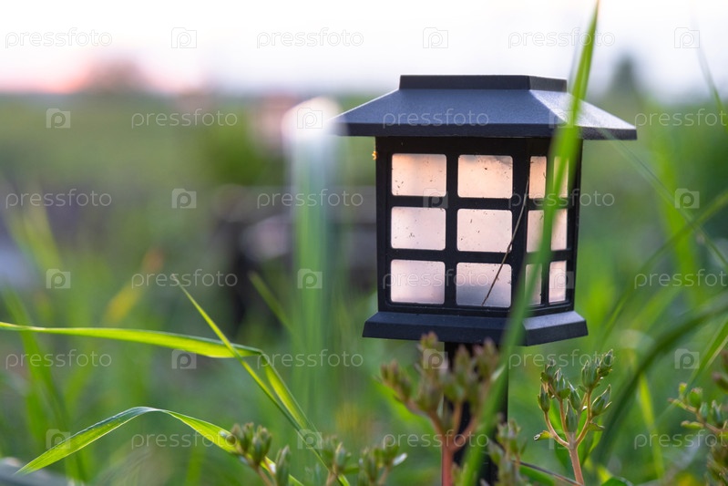 Ландшафтный фонарь на солнечной энергии, декоративная клумба с лилиями, орнаментальные травы, натуральная мульча, эко-сад, современный минимализм