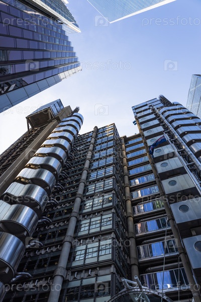 Высокие современные офисные здания с отражающими стеклянными фасадами, простирающиеся к небу в плотном городском центре города