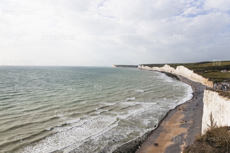 Потрясающий вид на белые известковые скалы, которые встречаются с морем вдоль крутой береговой линии.Драматический пейзаж имеет зеленые травянистые вершины и океанские волны, разбивающиеся ниже