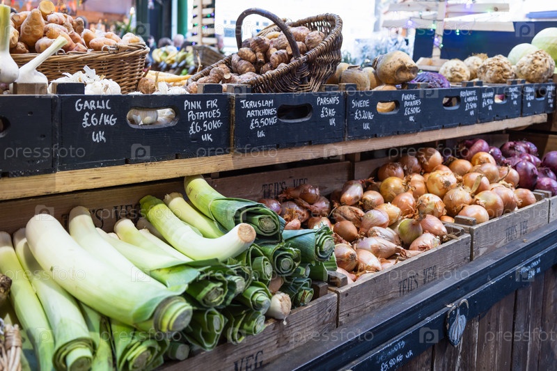 Свежие органические фарш и лук выставлены на деревянных полках с ценовыми ярлыками в известном лондонском рынке Borough Market