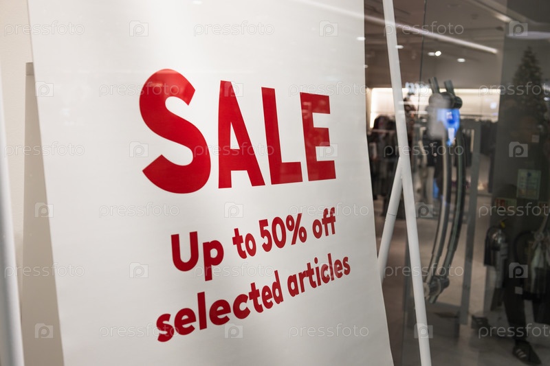 Закрытие рекламного знака со скидкой в магазине торгового центра, предлагающем половину цены на выбранный товар