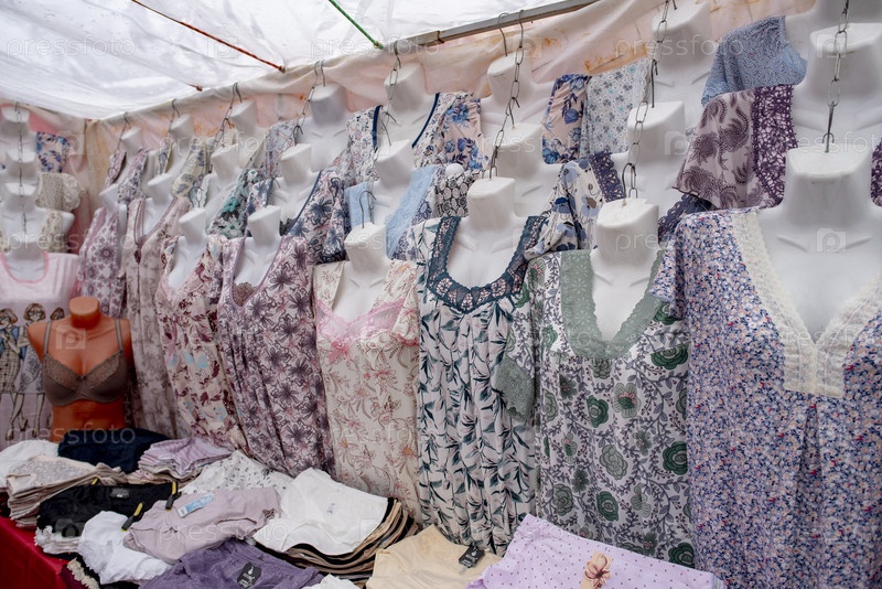 Лоток с одежной и аксессуарами на рынке. Москва