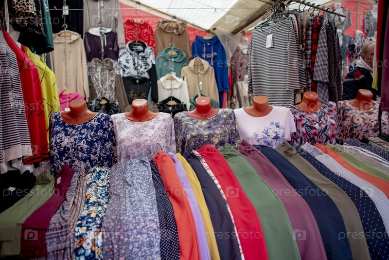 Лоток с одежной и аксессуарами на рынке. Москва