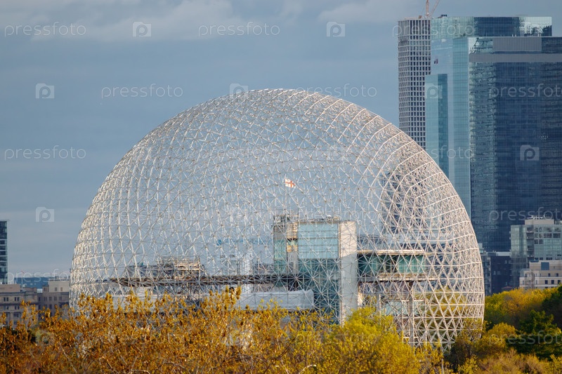 Вид монреальской биосферы с беспилотника в парке Жан-Драпо, на фоне - центр Монреаля.Квебек, Канада