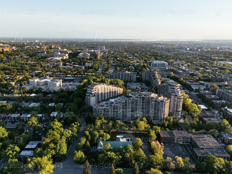 Вид с воздуха кампуса Монреальского университета и района Outremont, окруженного лесистой Маунт-Рояль на закате солнца в Монреале, Канада. g