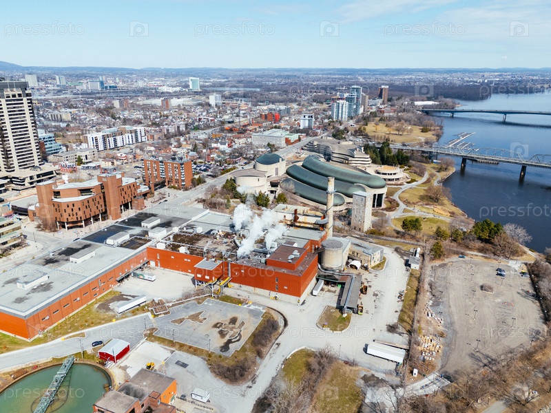Вид с воздуха на центр города Гатинеа в Квебеке с рекой Оттава, мостами и городским пейзажем в начале весны