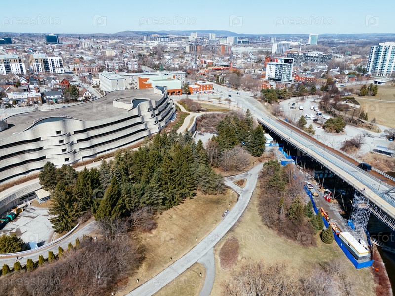 Вид с воздуха на центр города Гатинеа в Квебеке с рекой Оттава, мостами и городским пейзажем в начале весны