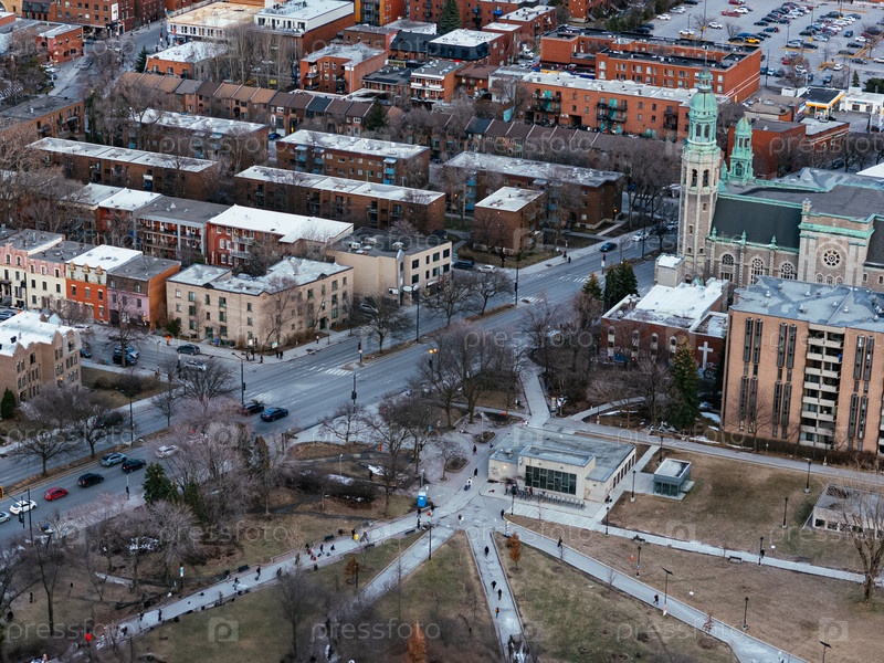 Вид из воздуха на городской пейзаж Монреаля недалеко от Лайонель Гроулс с исторической церковью, жилыми кварталами и горизонтом города, Квебек Канада. g