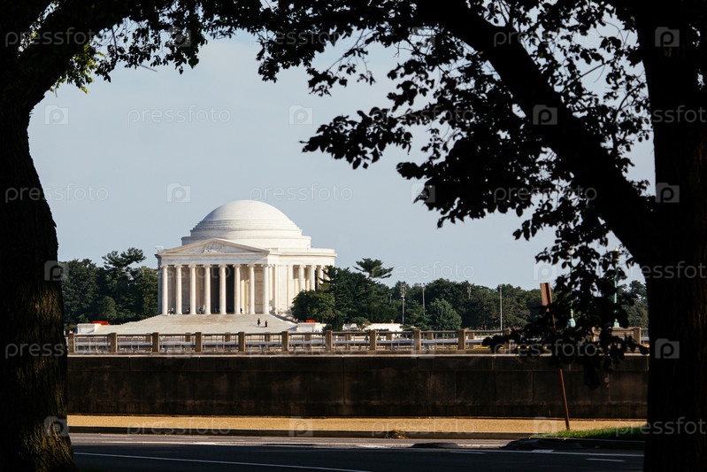 Мемориал Джефферсона, обрамленный деревьями в солнечный день в Вашингтоне, США, знаковая неоклассическая достопримечательность