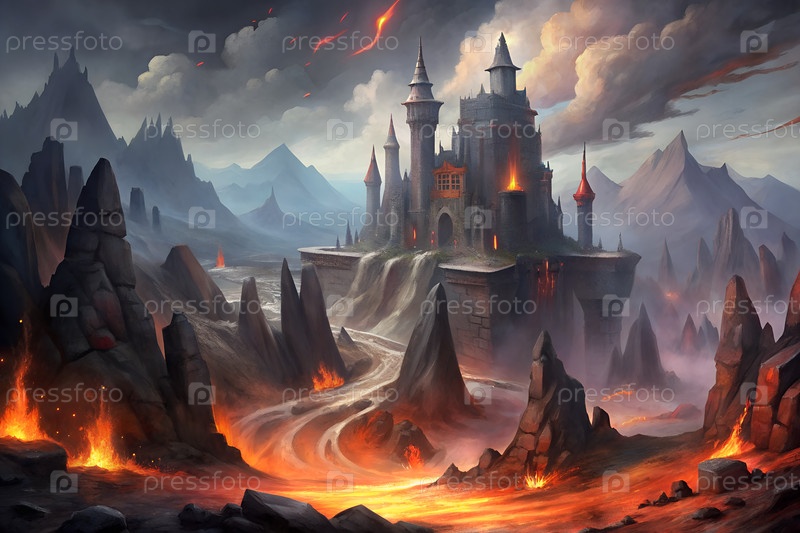 Фантастический замок на темном холме с извилистой дорогой, горами и светящимся огнем, драматической пейзажной сценой