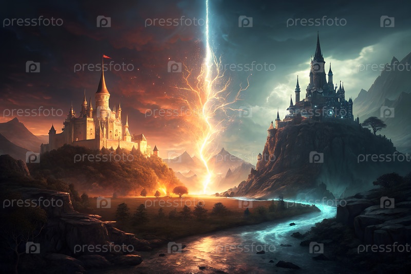 Эпический фэнтезийный пейзаж с молнией, разделяющей два царства, когда волшебники сталкиваются с горящими и замороженными замками в сумерках