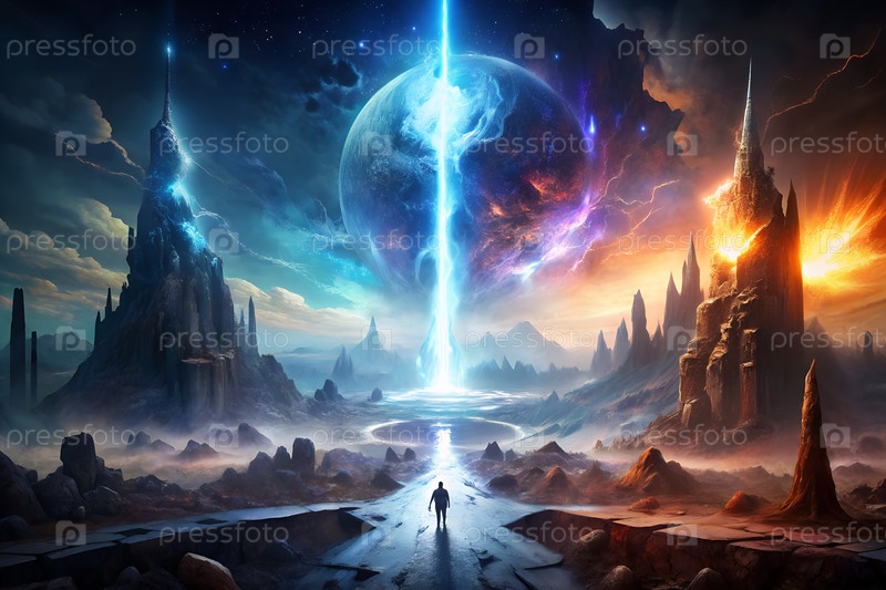 Эпический фэнтезийный пейзаж с молнией, разделяющей два царства, когда волшебники сталкиваются с горящими и замороженными замками в сумерках