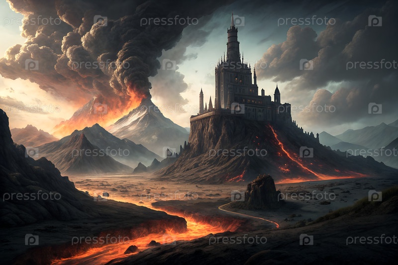 Фантастический замок на темном холме с извилистой дорогой, горами и светящимся огнем, драматической пейзажной сценой