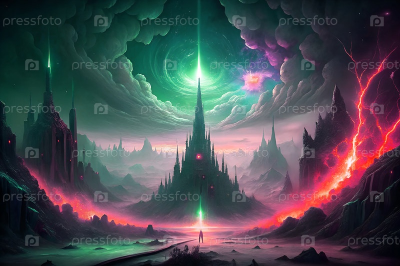 Эпический фэнтезийный пейзаж с молнией, огнем и космическим светом над мистической долиной, когда одинокий герой сталкивается со своей судьбой