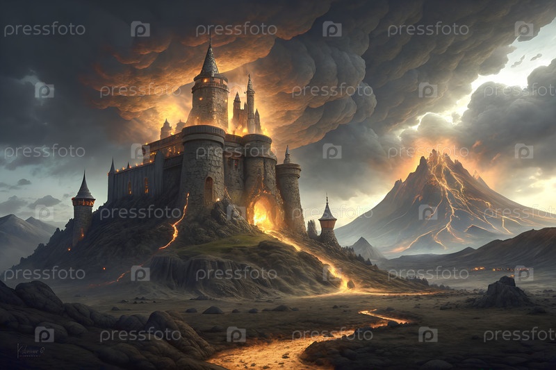 Фантастический замок на темном холме с извилистой дорогой, горами и светящимся огнем, драматической пейзажной сценой