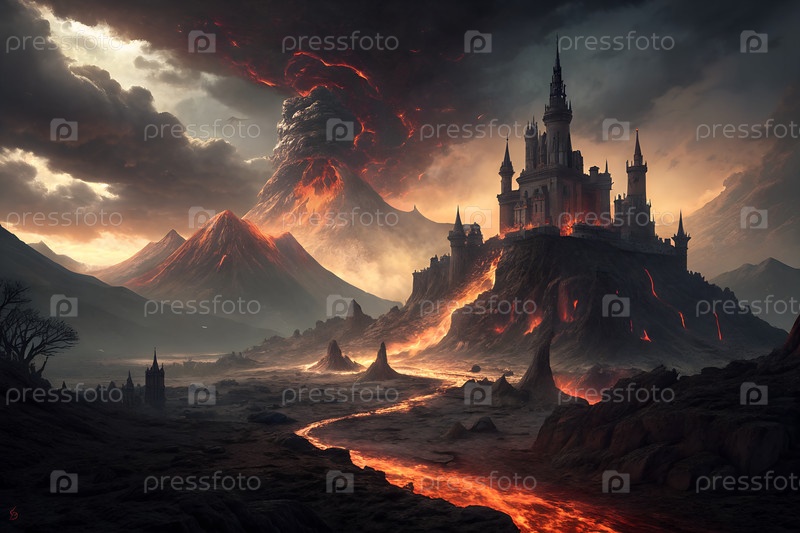 Фантастический замок на темном холме с извилистой дорогой, горами и светящимся огнем, драматической пейзажной сценой