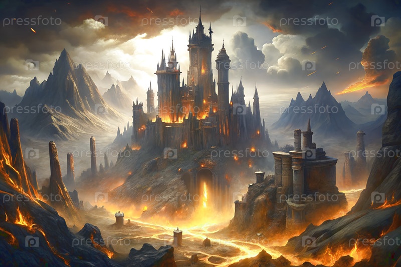 Фантастический замок на темном холме с извилистой дорогой, горами и светящимся огнем, драматической пейзажной сценой