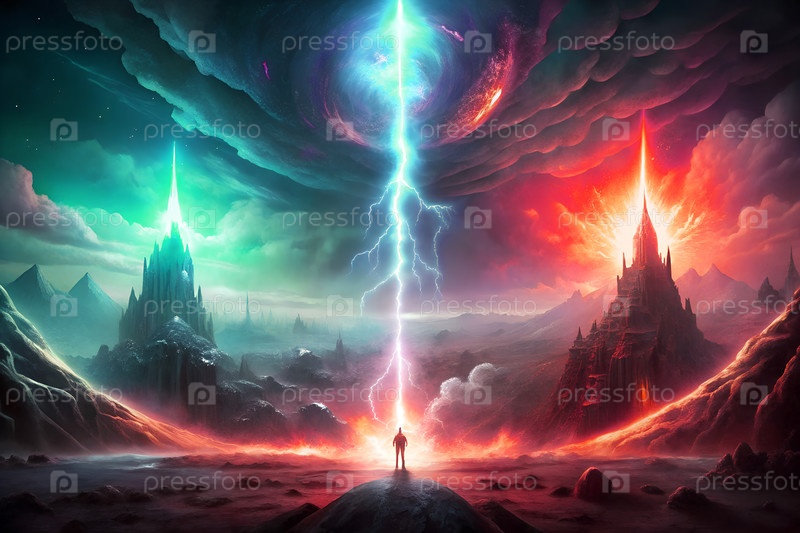 Эпический фэнтезийный пейзаж с молнией, разделяющей два царства, когда волшебники сталкиваются с горящими и замороженными замками в сумерках