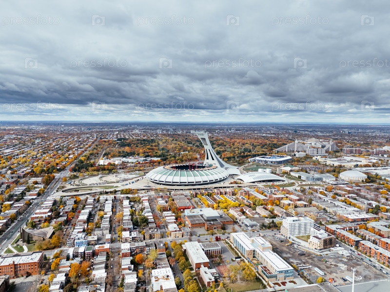 Осенний вид горизонта центра Монреаля с знаковой башни Олимпийского стадиона. g