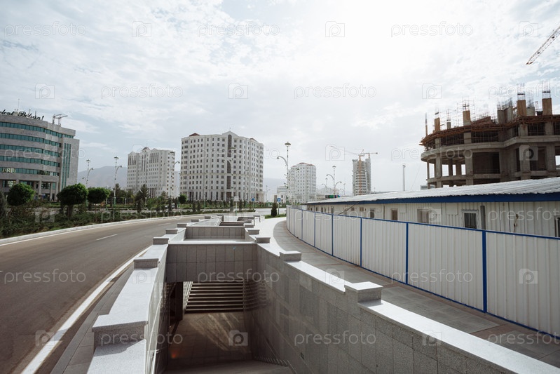 Широкий бульвар с белыми мраморными правительственными зданиями в Ашхабаде, Туркменистан, современный пустой городской пейзаж