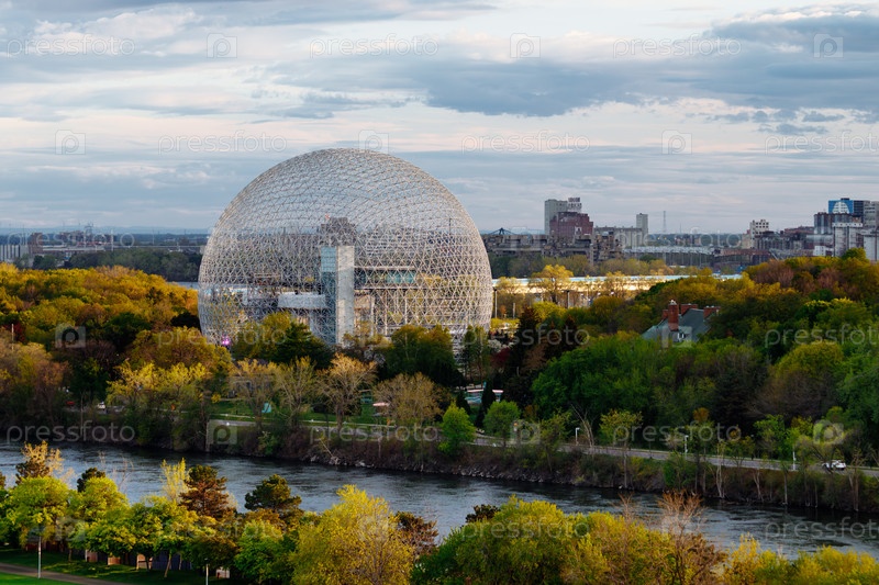 Вид монреальской биосферы с беспилотника в парке Жан-Драпо, на фоне - центр Монреаля.Квебек, Канада