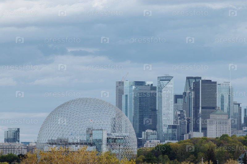 Вид монреальской биосферы с беспилотника в парке Жан-Драпо, на фоне - центр Монреаля.Квебек, Канада