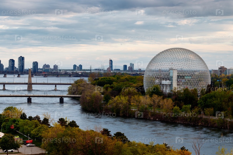 Вид монреальской биосферы с беспилотника в парке Жан-Драпо, на фоне центр Монреаля.Квебек, Канада