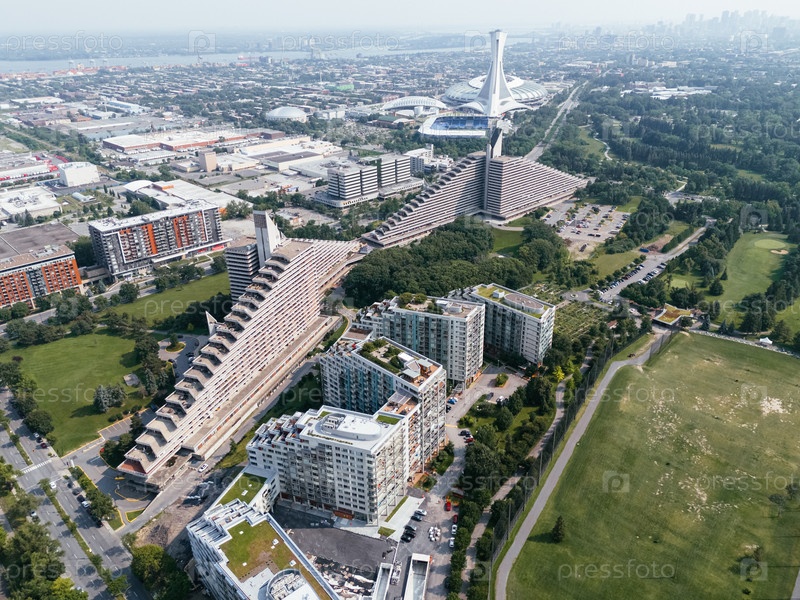 Вид с воздуха Олимпийской деревни Монреаля возле олимпийского стадиона с жилыми зданиями и парком, Канада. g